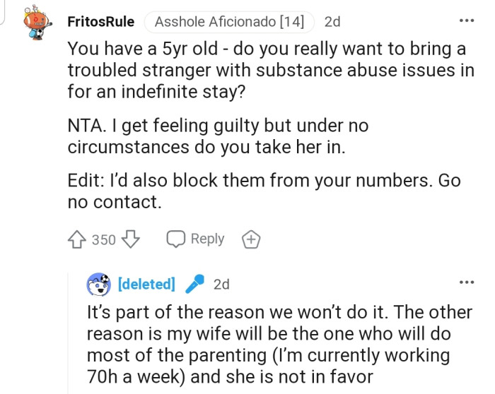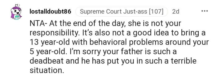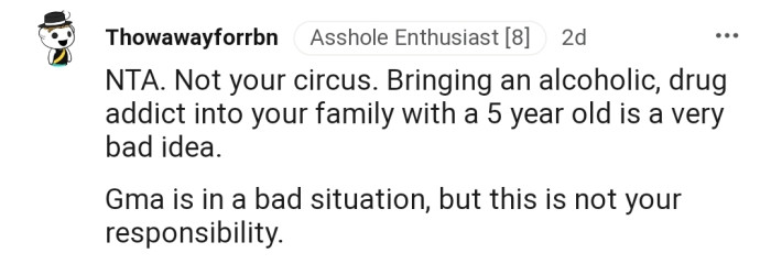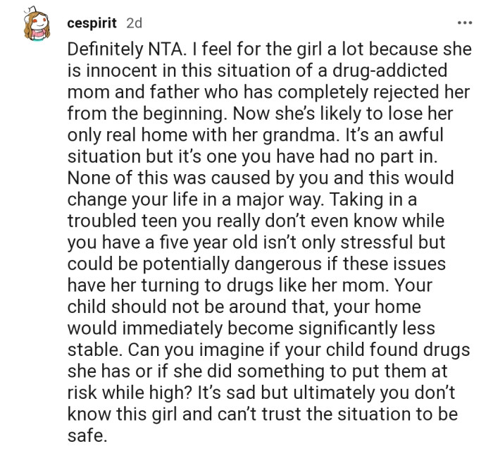 In addition, commenters have warned OP to be wary of their half-sister's lifestyle, which could negatively influence their 5-year-old if they share the same space.