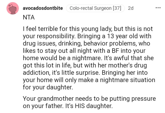At this point, the burden fell on the girl's grandmother to raise her. OP's half-sister is now 13, and her grandmother is facing a health crisis.