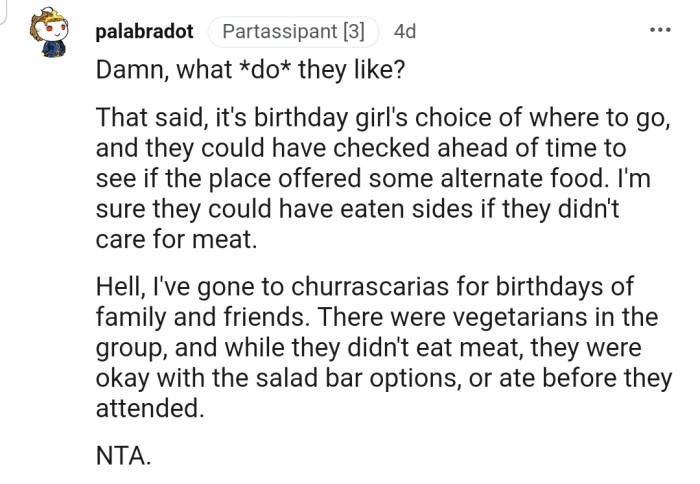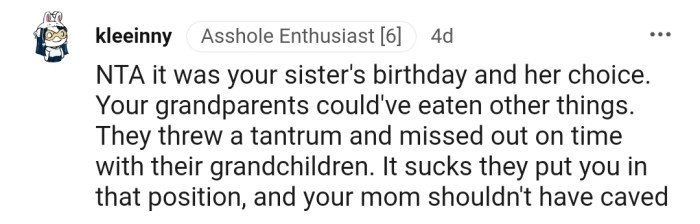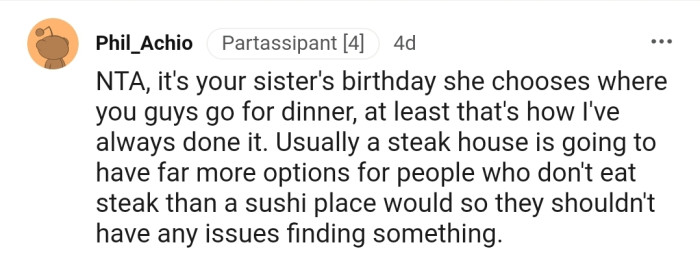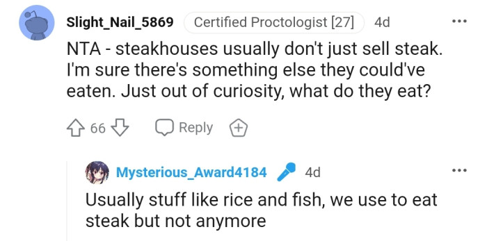 However, the situation took a different turn when OP's half-sister's birthday arrived. Their half-sister expressed her desire to dine at a steakhouse, which raised some eyebrows because their grandparents are also not fans of steak.
