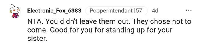 Now that Grandpa and Grandma were fully on board, they decided it was better to move the celebration to another restaurant rather than the one OP's half-sister had chosen. This decision left OP feeling a sense of injustice.