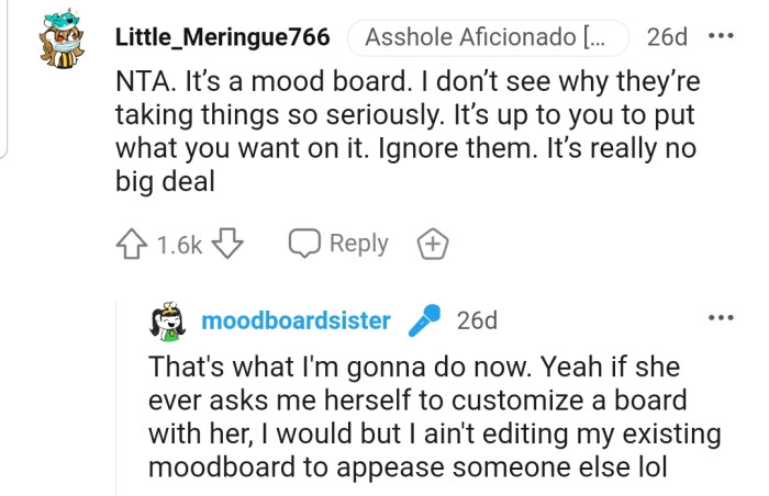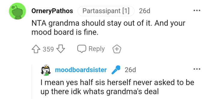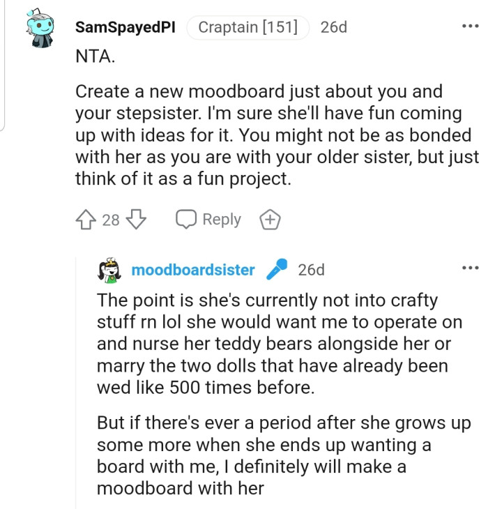 In addition, some commenters have suggested that OP creates a separate mood board to celebrate her connection with her younger half-sister.