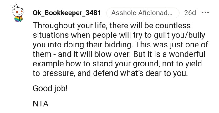"It is a wonderful example how to stand your ground, not to yield to pressure, and defend what’s dear to you. Good job!"