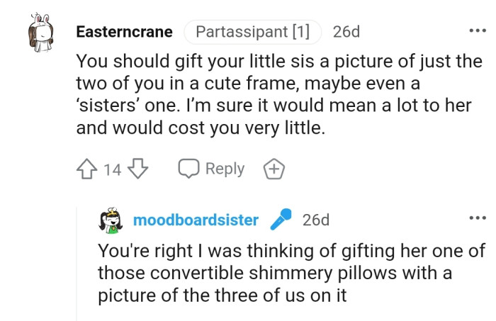"You should gift your little sis a picture of just the two of you in a cute frame, maybe even a ‘sisters’ one."