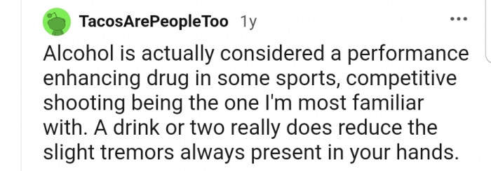 "Alcohol is actually considered a performance-enhancing drug in some sports"