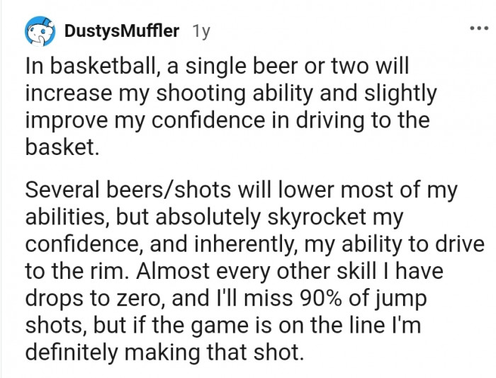 "In basketball, a single beer or two will increase my shooting ability and slightly improve my confidence in driving to the basket."