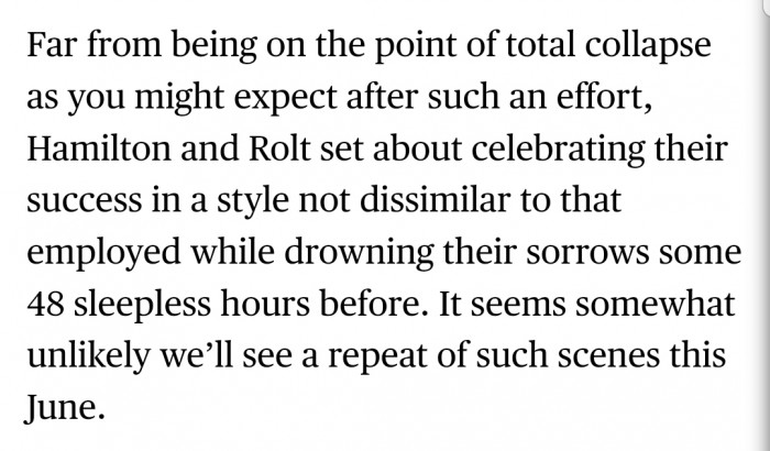 "The fact he broke his nose during the race, drunk, and won is almost unbelievable."