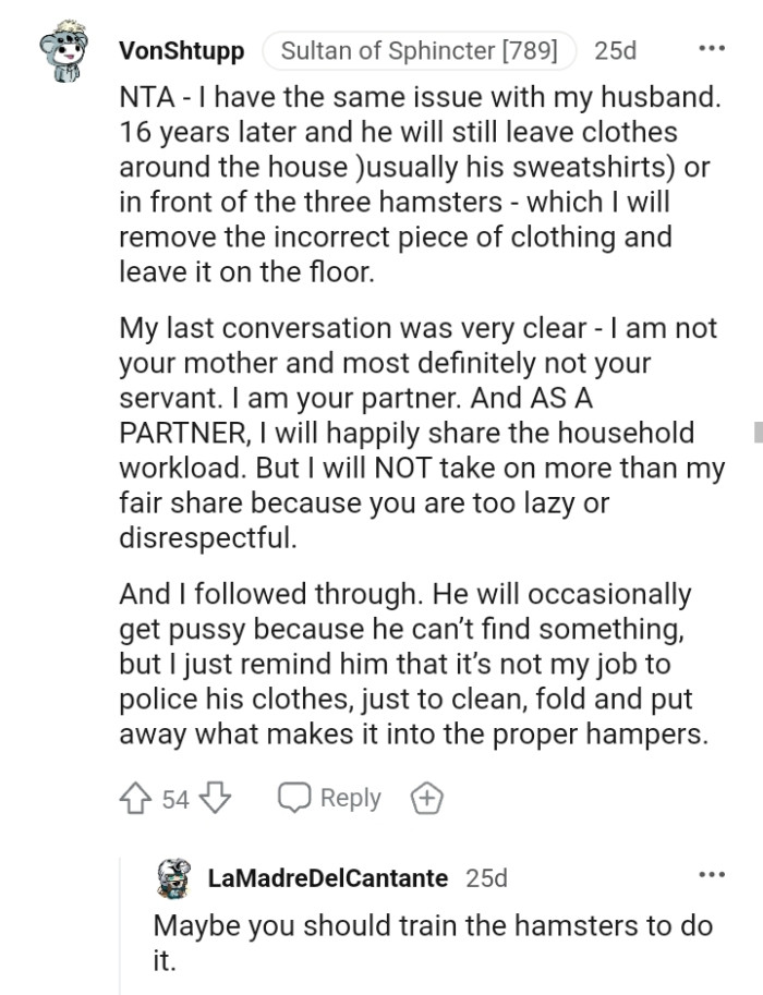 Many Redditors believed that it was better for him to take care of his own clothes. The OP received the not the AH verdict, and you can share this post with your loved ones if you agree.