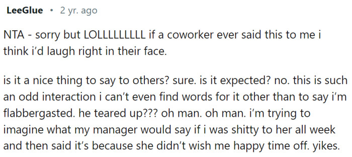 Manager Shocked After Seeing Employee Break Down In Tears Because She Didn't Wish Him "Happy Vacation"