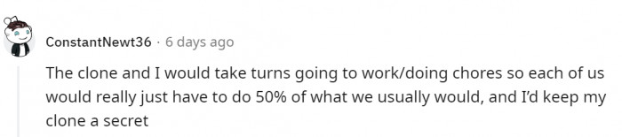 "The clone and I would take turns going to work/doing chores"