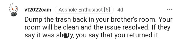 Reddit.comOP's mom dumped their brother's trash in their room, and it got them really upset