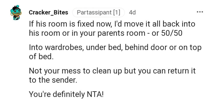 Interestingly, OP's brother discovered the post and realized he was wrong to expect OP to clean up a mess he and their mom made. He apologized to OP, cleaned up the room, and disposed of the trash in the dumpster.