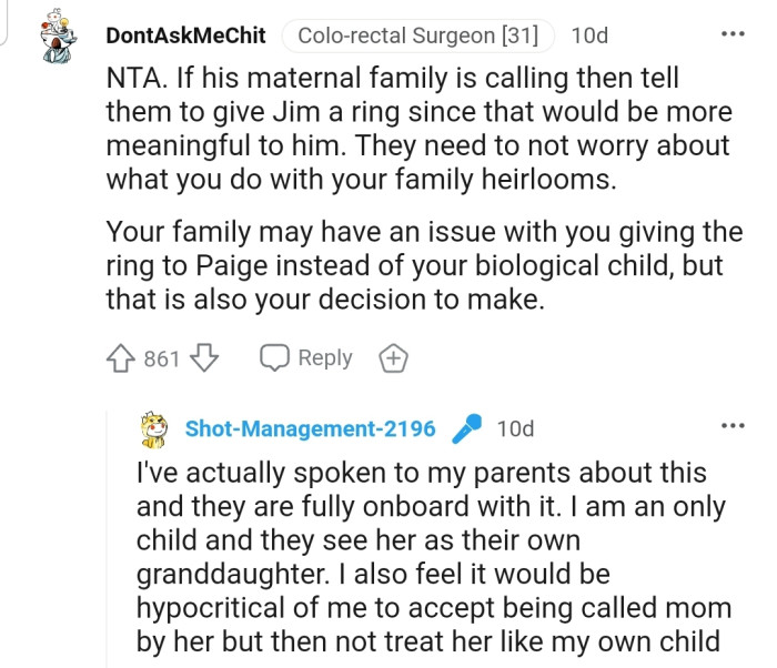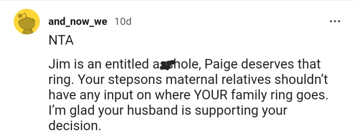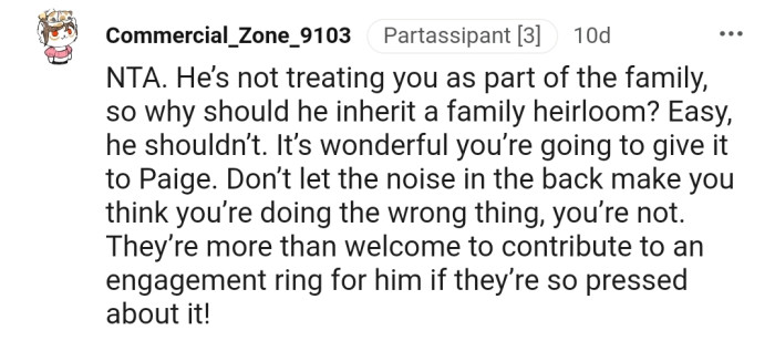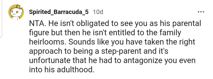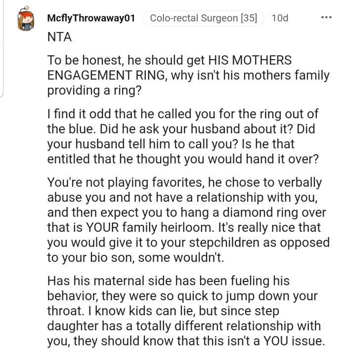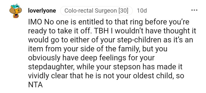 The commenters gave OP the enviable title of NTA. They believe that OP’s stepson doesn’t deserve to receive the ring, as he was only choosing to acknowledge her as a mother in order to get the ring.
