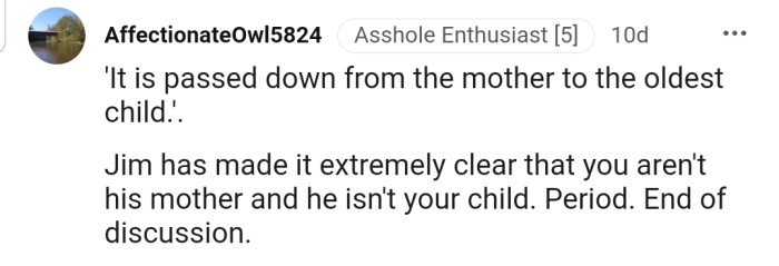 Reddit.comOP has a family heirloom that is supposed to be passed down to the oldest child, but OP has refused to hand it over to her stepson due to the way he treats her. Now he and his maternal side of the family are on OP's case.
