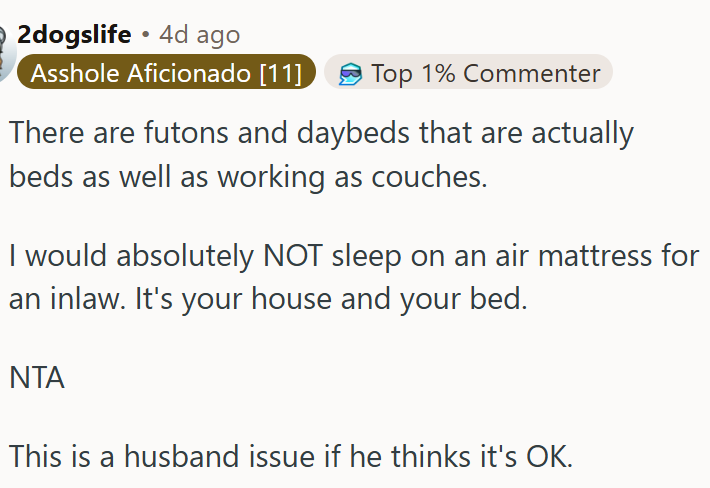The conflict arose when OP’s husband suggested giving his mother their bedroom and sleeping on the air mattress themselves. He felt it would only be for occasional visits, but OP was uncomfortable with the idea.