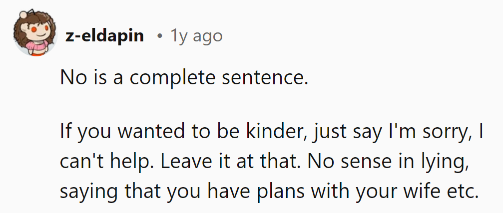 "No" stands alone. A polite "Sorry, can't help" does the trick without needing to invent excuses with the wife.