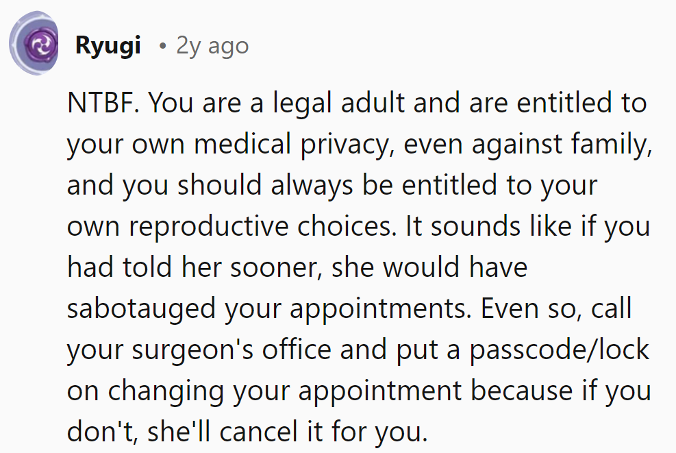 Her mother saw the surgery as an unnecessary and drastic decision, leading to significant tension in their relationship. Instead of viewing it as a necessary medical procedure, her mother perceived it as a cosmetic choice and even threatened to increase her daughter's financial responsibilities.