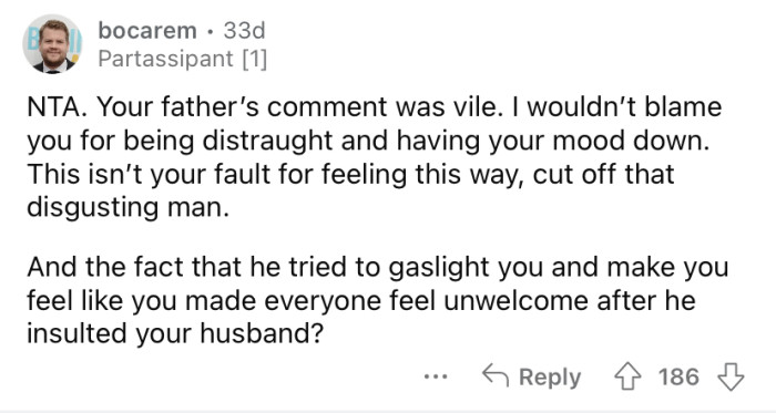 The OP was shocked. Her father had made the comment in front of her husband, and she could tell that it really hurt him.