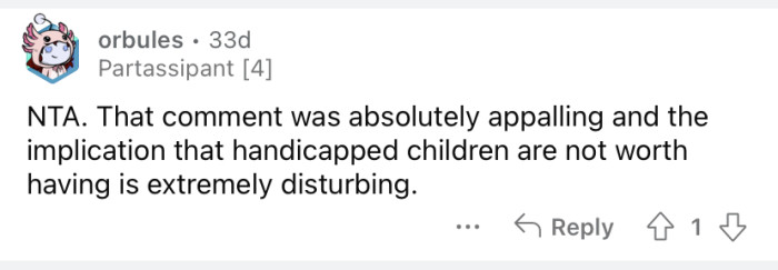 The OP says this was a sensitive topic as they have been trying to conceive for some time with no success. They quickly moved on and continued with the gifts, but then her father said, "I didn't think you wanted any if they might be handicapped."