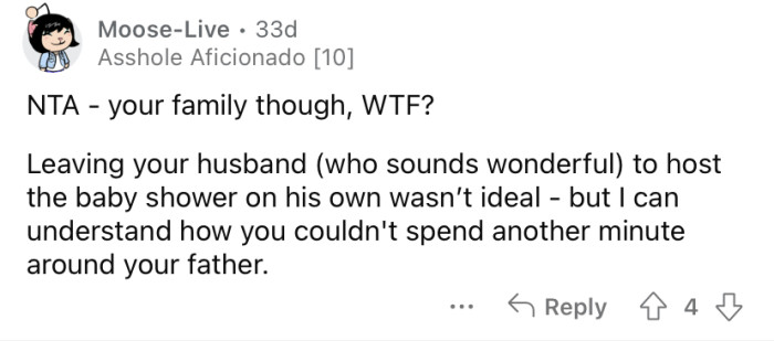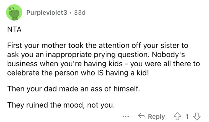 Family dynamics play a pivotal role in shaping individual self-esteem and interpersonal relationships. When a family member makes a hurtful remark, it can trigger feelings of inadequacy and defensiveness, which are well-documented in psychological literature. According to research published in the Journal of Family Psychology, negative interactions with family members can lead to significant emotional distress, particularly when they occur during important life events, such as a baby shower. This emotional distress can manifest as withdrawal or avoidance behaviors, as seen in the Redditor's decision to hide during the event.