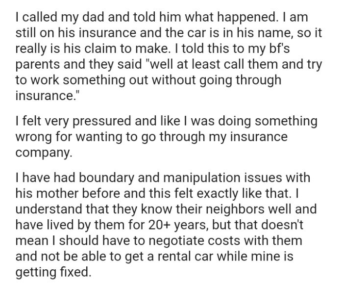 Redditor Wants To Go Through Insurance After Boyfriend's Neighbor Hit Her Car, BF's Parents Tell Her Not To