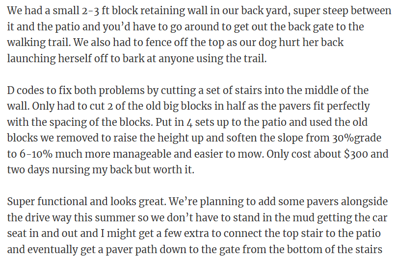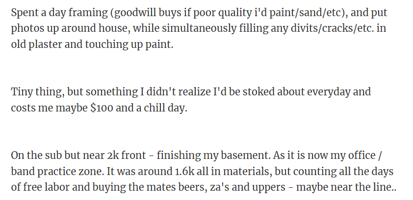 "Cost me $150 and was 1000% worth it. DIY fire pit was about $50 worth of retaining wall blocks, also completely worth it.Upgraded the dishwasher to a Bosch 800 series with crystaldry. It gets your dishes dry like a dishwasher from the 80s but without the heating coil that melts your plastic stuff. That thing is some sort of German black magic."