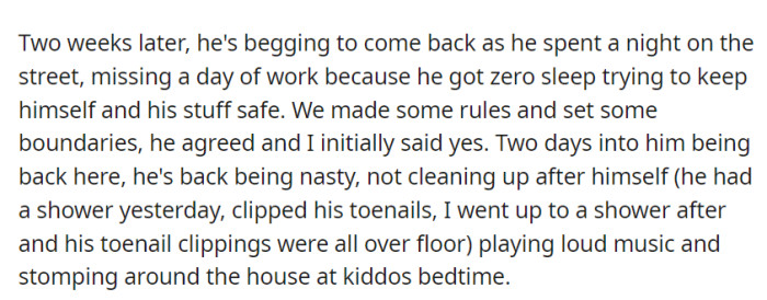 Reddit"S" asked to return after a night on the street, but soon broke the rules and disrupted the household.