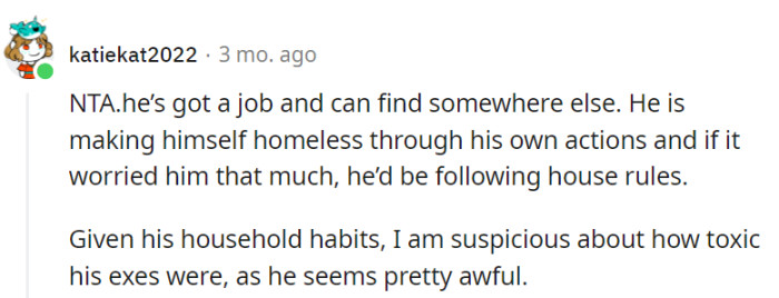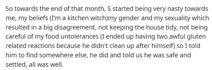 His behavior shifted from gratitude to hostility, specifically targeting OP's beliefs, gender, and sexuality. This, coupled with his lack of regard for basic hygiene and household cleanliness, led to a chaotic environment.