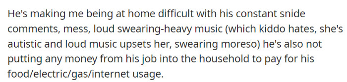 "He's making being at home difficult with his constant snide comments, mess, and loud, swearing-heavy music."