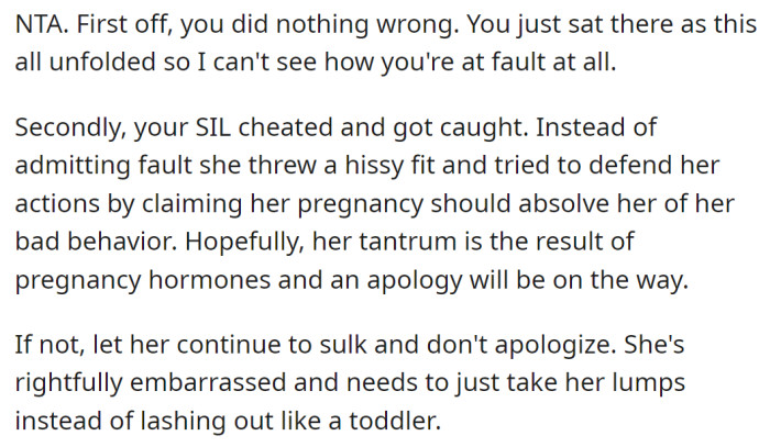 She mentioned her pregnancy and expressed disappointment that the OP didn't let her win. Then, she left the room angrily and has been bad-mouthing the OP and her husband since.