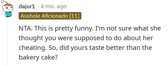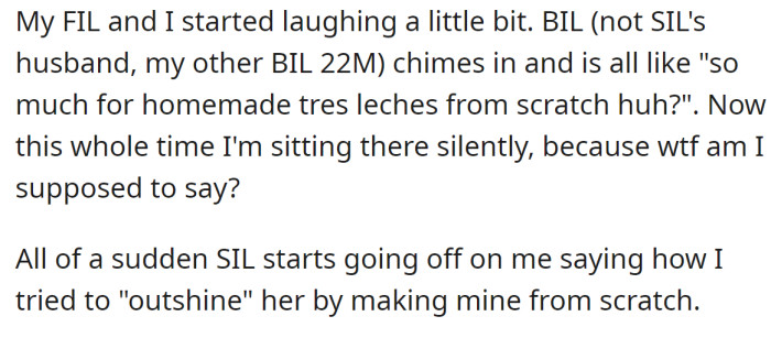 This led to laughter from the OP and her father-in-law, while another family member commented on the irony of claiming homemade authenticity. The SIL became upset and accused the OP of trying to outshine her by making a cake from scratch.