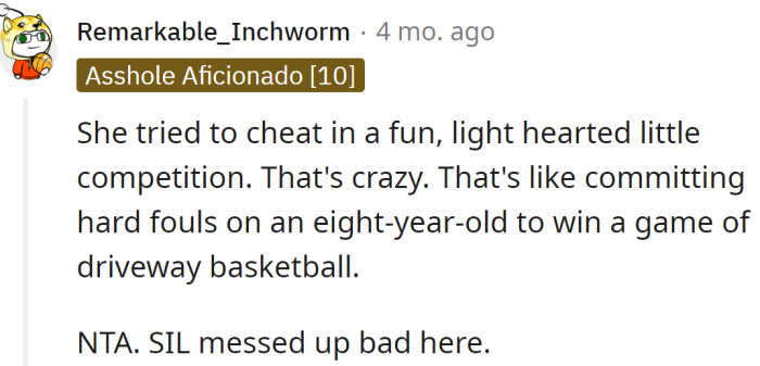 The OP feels sorry, as the competition was meant to be a light-hearted and enjoyable event, but it's not her fault that her SIL bought the cake. Their family is divided, with some believing that the OP should have given the SIL a heads-up about the competition's details beforehand.