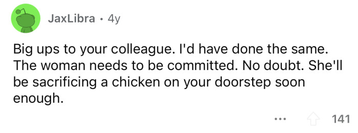 "She'll be sacrificing a chicken on your doorstep soon enough."