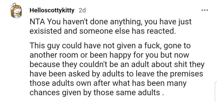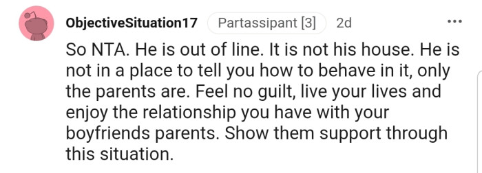 "He is out of line. It is not his house. He is not in a place to tell you how to behave in it, only the parents are."