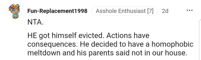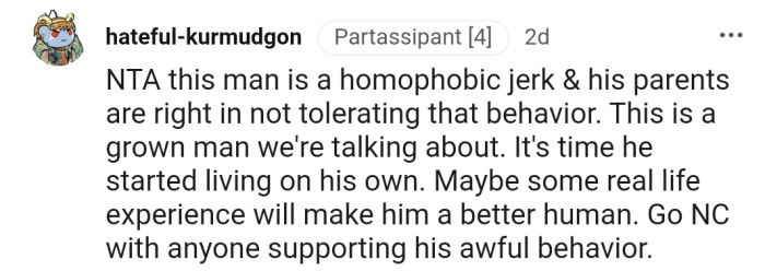 "This man is a homophobic jerk & his parents are right in not tolerating that behavior."