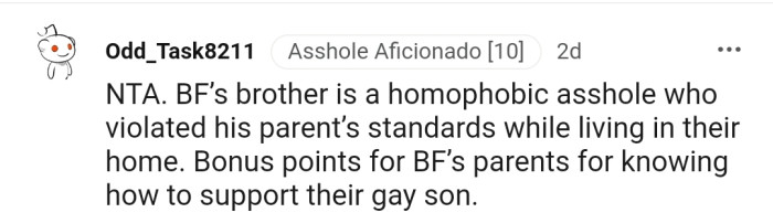 "BF’s brother is a homophobic a**hole who violated his parent’s standards while living in their home."