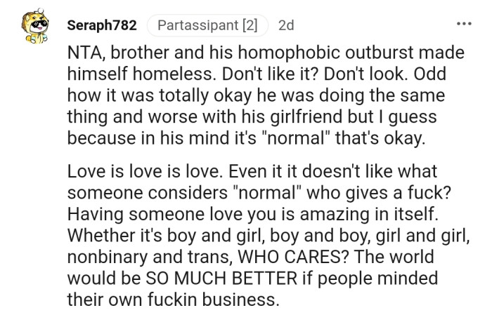 "Brother and his homophobic outburst made himself homeless. Don't like it? Don't look."