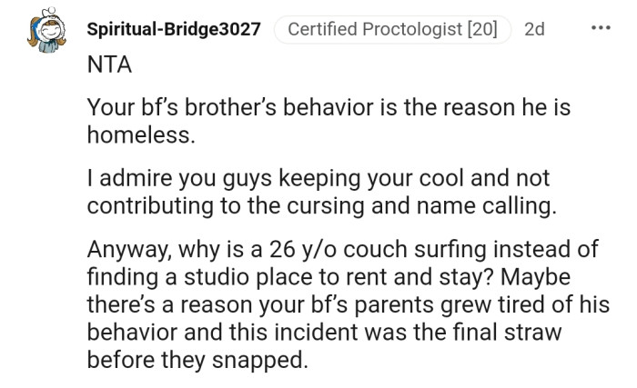 "NTA...Your bf’s brother’s behavior is the reason he is homeless."