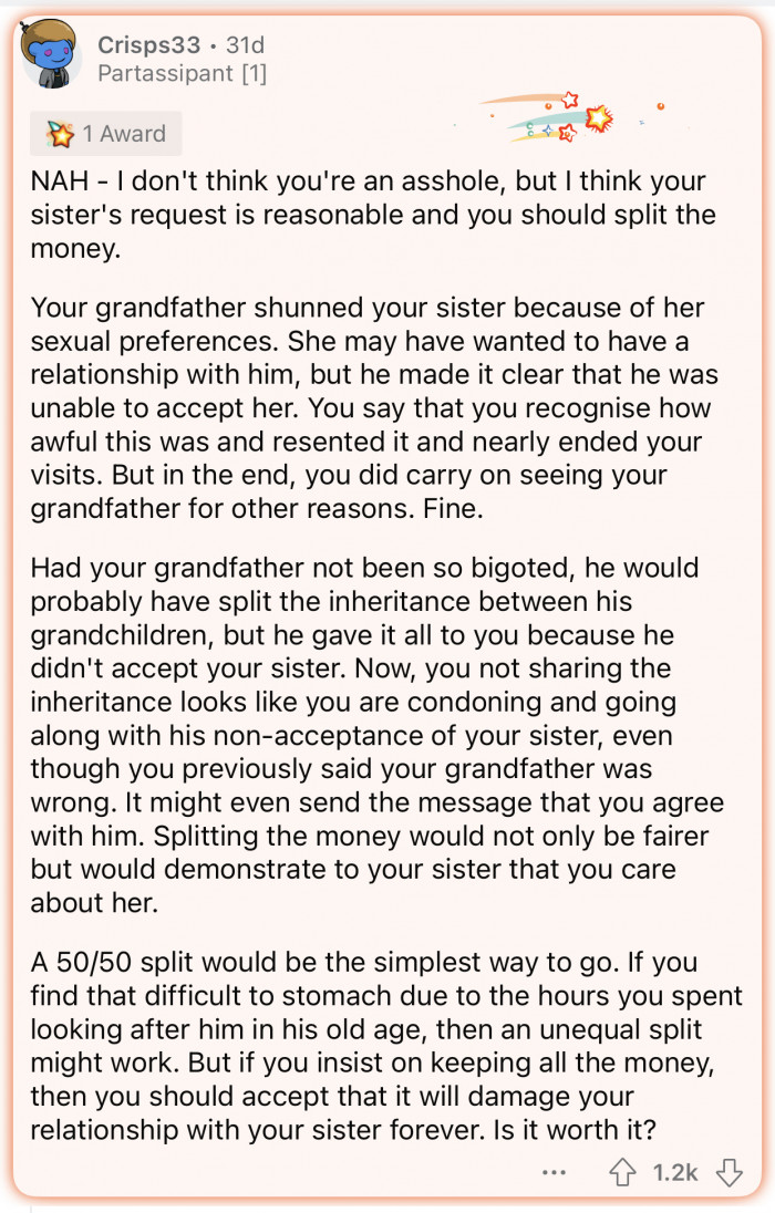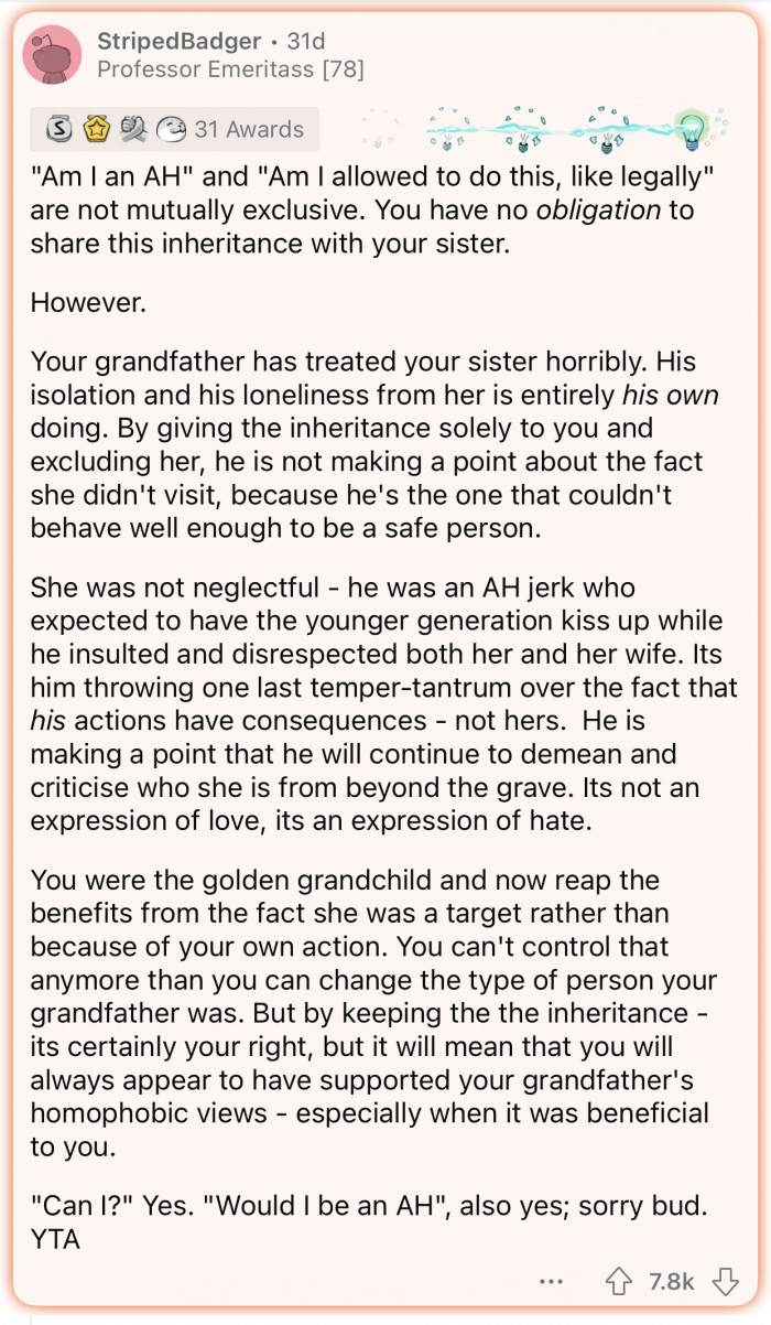 In a recent case, a Redditor shared how his homophobic grandfather passed away and left no inheritance for his sister due to her LGBTQ+ identity. The sister demanded half of the inheritance, but the user felt as if she was not entitled to what is now legally his money.