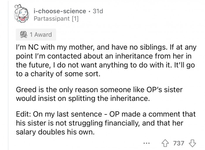 Well, this was an interesting story. OP isn't legally obligated to share the inheritance money with his sister.