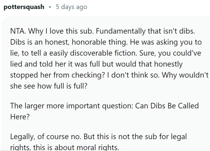 "Dibs is an honest, honorable thing. He was asking you to lie."