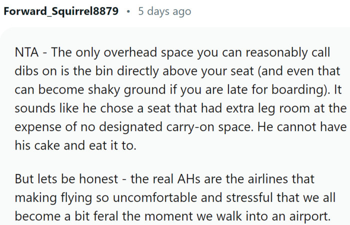 Redditor Gets Called Out On Flight For Not Honoring Dibs On Overhead Compartment