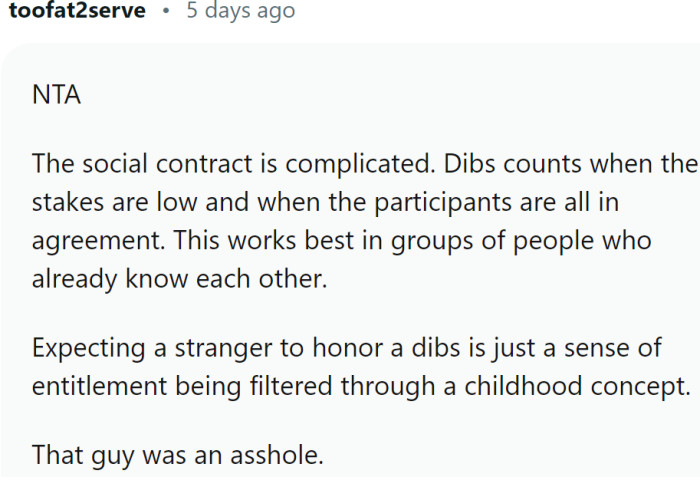 "Dibs counts when the stakes are low and when the participants are all in agreement."