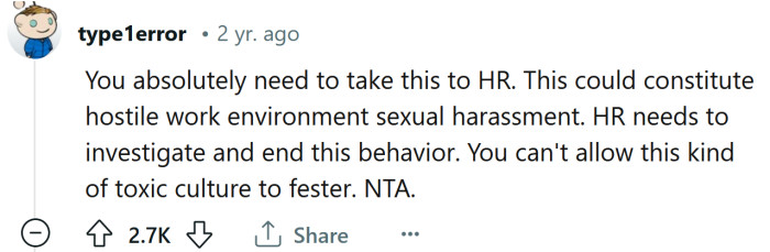 Now the OP is wondering if she would be the a**hole for going to HR. Keep scrolling to see how people reacted.