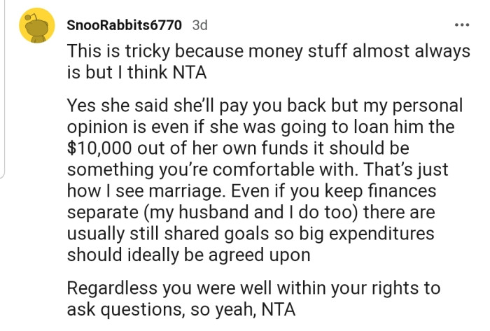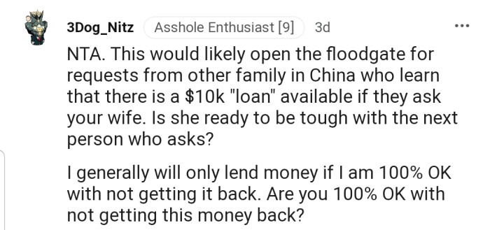 Reddit.comOP's wife asked him for a $10,000 loan to help her brother buy a house