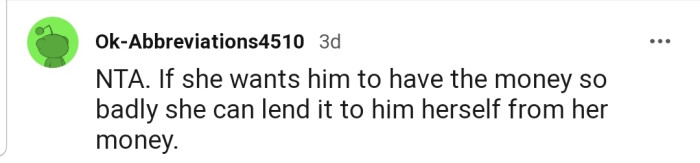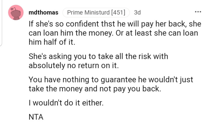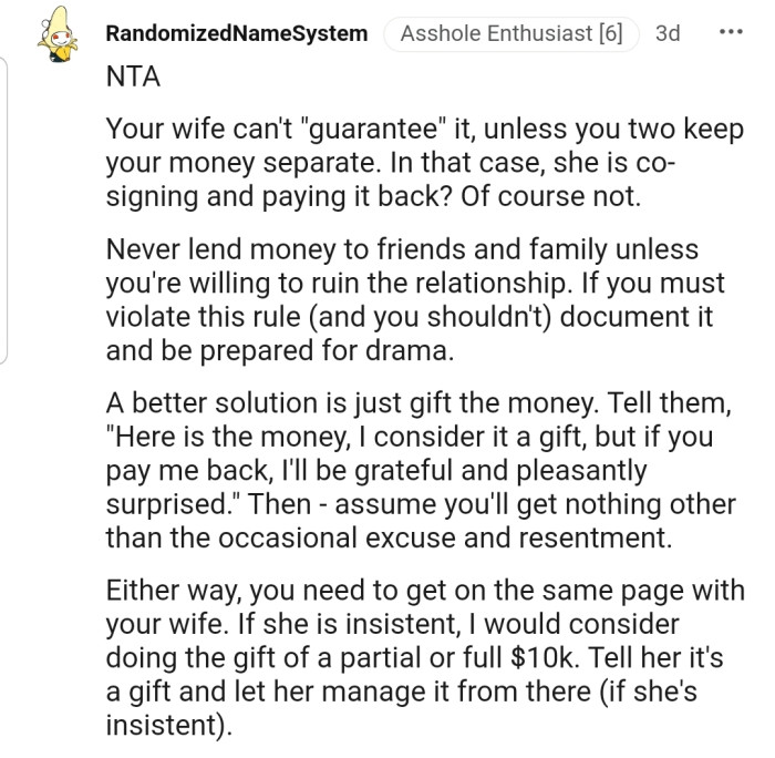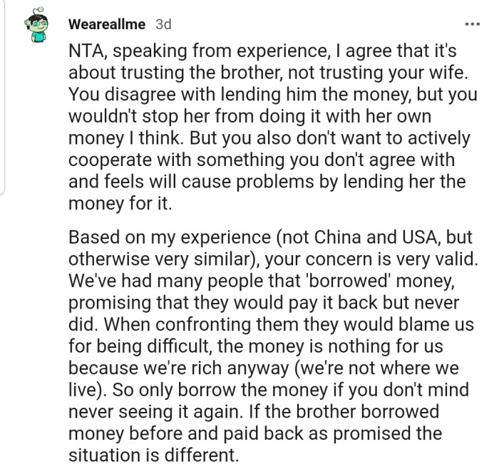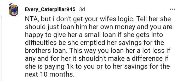 According to the commenters, OP’s wife should be the one to take the risk of loaning her brother the money if she wants to help him out so much.