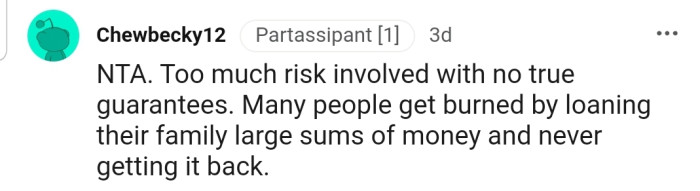 "Many people get burned by loaning their family large sums of money and never getting it back."