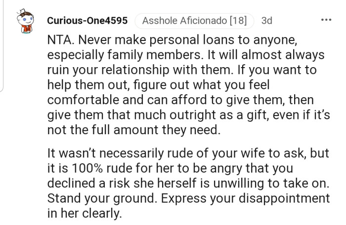 He didn’t hesitate to ask them, which eventually led to his wife getting upset and retracting her request for a loan. She then claimed that she couldn’t rely on OP for financial aid anymore, prompting him to ask the critical AITA question.