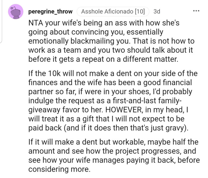 He shared on the AITA subreddit that his wife had recently asked him about his work bonus and requested that he lend her $10,000.