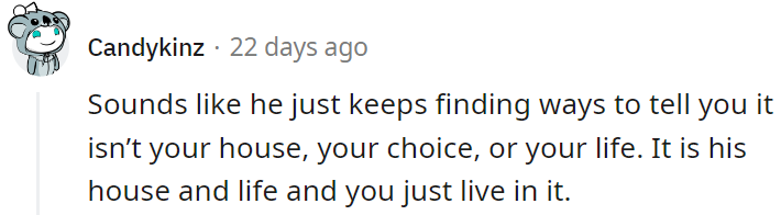 "Sounds like he just keeps finding ways to tell you it isn’t your house, your choice, or your life."
