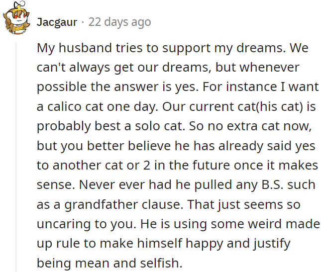 OP didn’t think this was fair. Didn’t her lifelong dream of being a dog mom count as a ‘grandfather clause’ on its own?